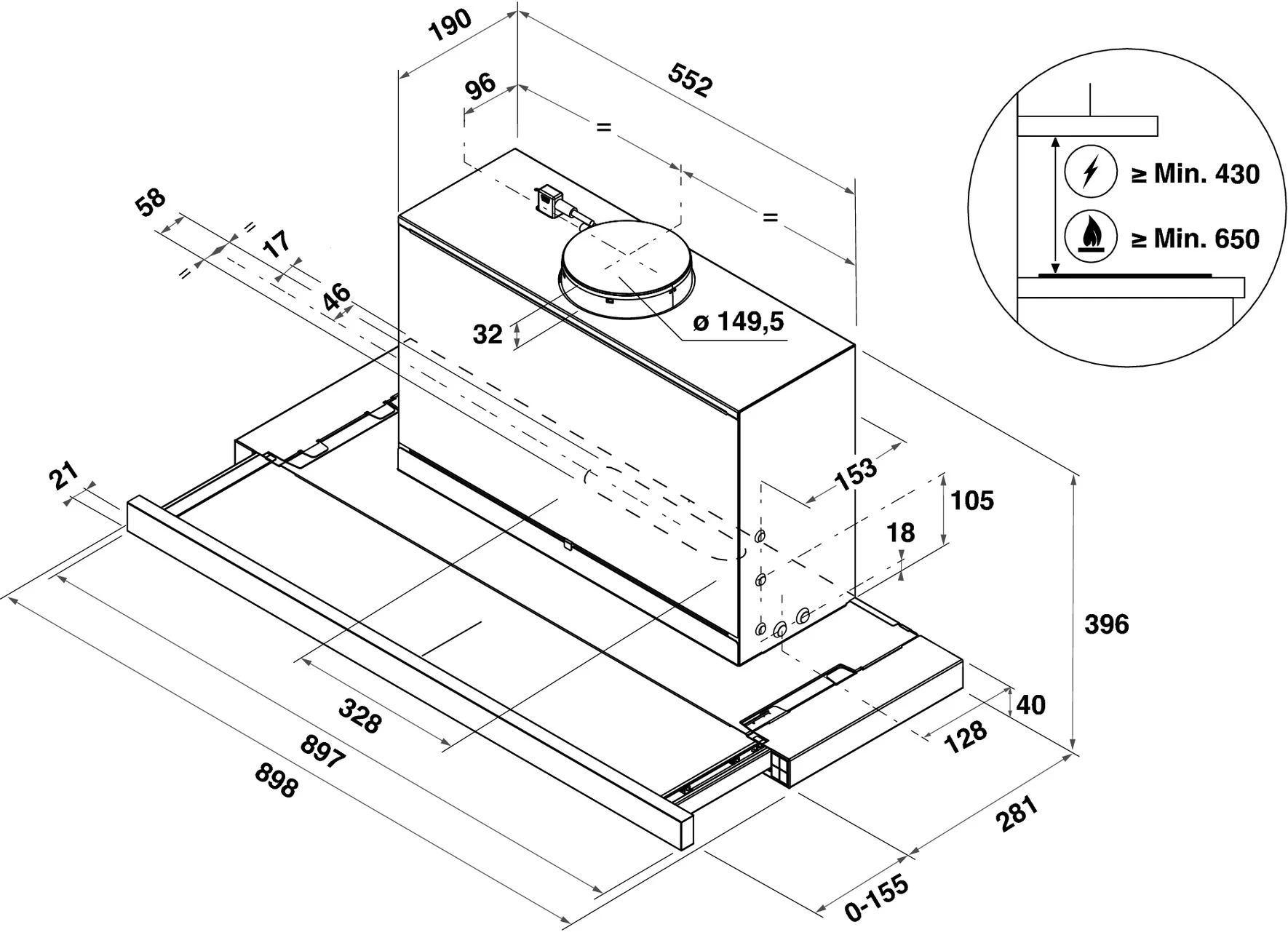 - Flachschirmhaube mit 90 cm Breite, passend für einen 60 cm breiten Oberschrank