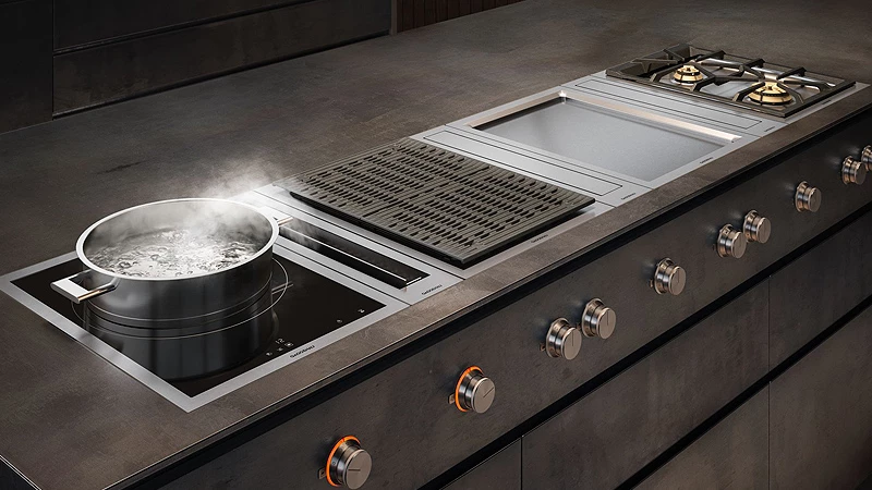 Combine our modular options into a harmonious whole to create your ideal culinary creative space. With widths ranging from 15 cm to 90 cm, this very homogeneous series merges modern performance with intelligent design. Create your ideal cooktop by choosing from Teppan Yaki, Flex Induction, Gas, Grill, or Downdraft Ventilation.