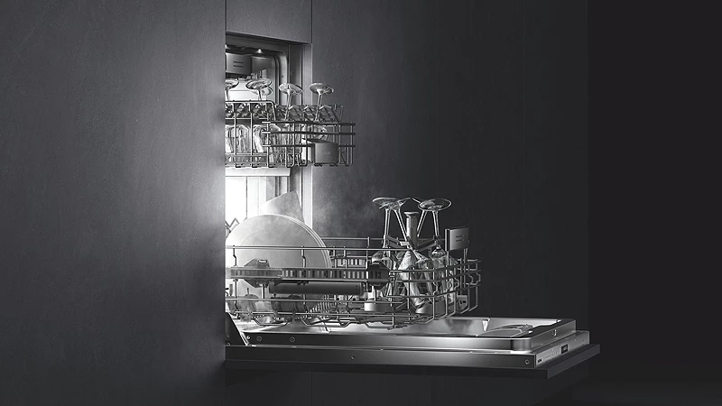 Give your dishes the premium treatment they deserve. Our dishwashers from Series 400 and 200 not only feature a clear TFT display but also handle-less push-to-open doors, a projection of the remaining time on the floor, and intelligent loading options for large and valuable items. The illuminated interior of Series 400 showcases your precious dishes, while the Zeolith technology ensures optimal drying performance. This is how dishwashing is done with maximum care and efficiency.