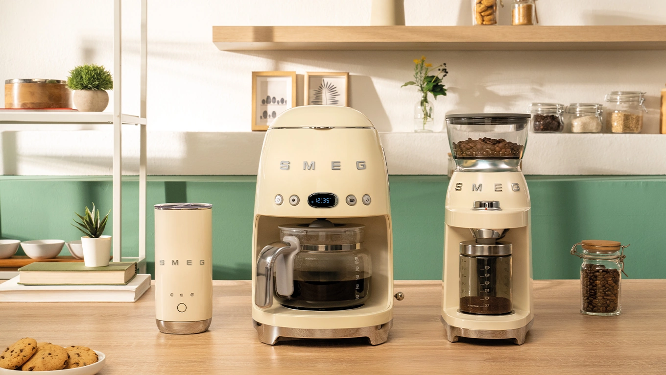 A set for coffee lovers who want to enjoy the full aroma of freshly ground coffee, classic filter coffee, and creamy milk foam in a stylish creamy retro design: We recommend the SMEG Retro Coffee Machine in Cream plus matching accessories.