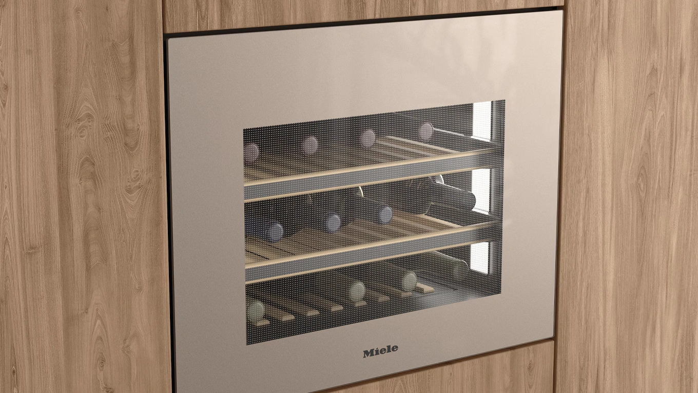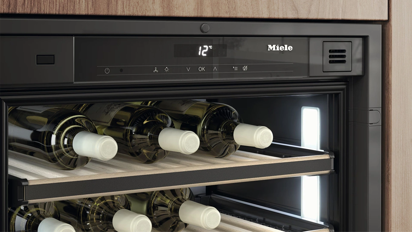 Here's the ideal solution for wine cooling: The Miele KWT 7112 iG wine cooler in Pearl Beige, which offers space for up to 18 wine bottles, stored on high-quality wooden shelves with low vibration. Thanks to FlexiFrame Plus, even larger bottles can be stored flexibly and safely. The tinted glass front with UV filter optimally protects your wine from harmful light, while the soft LED lighting stylishly showcases the wine rack.