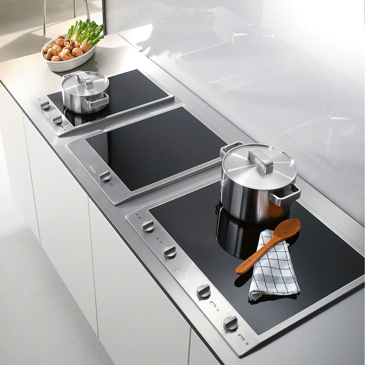 Miele CombiSet Module lassen sich vielseitig miteinander kombinieren. Geräte im ProLine Design, wie Induktionsfläche, Grill, Tischlüfter und Wok können ganz individuell zu einer großen Kochfläche gestaltet werden. Optisch sorgen die Modelle professionellen Ansprüchen. Sie sind durch einen umlaufenden Edelstahlrahmen eingefasst und werden mithilfe massiver Metallknebel bedient.