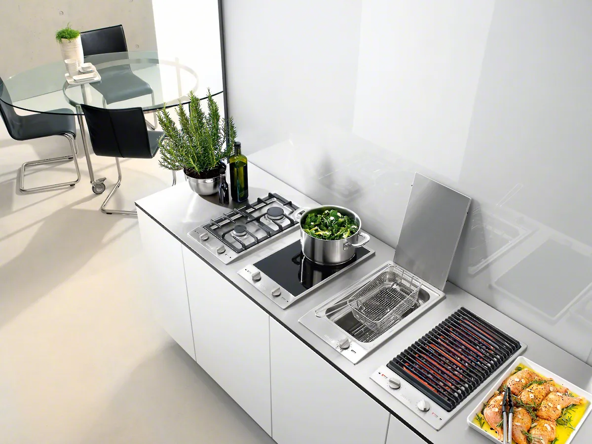 Miele CombiSet Module lassen sich vielseitig miteinander kombinieren. Geräte im ProLine Design, wie Induktionsfläche, Grill, Tischlüfter und Wok können ganz individuell zu einer großen Kochfläche gestaltet werden. Optisch sorgen die Modelle professionellen Ansprüchen. Sie sind durch einen umlaufenden Edelstahlrahmen eingefasst und werden mithilfe massiver Metallknebel bedient.