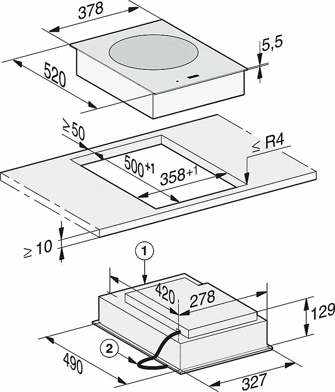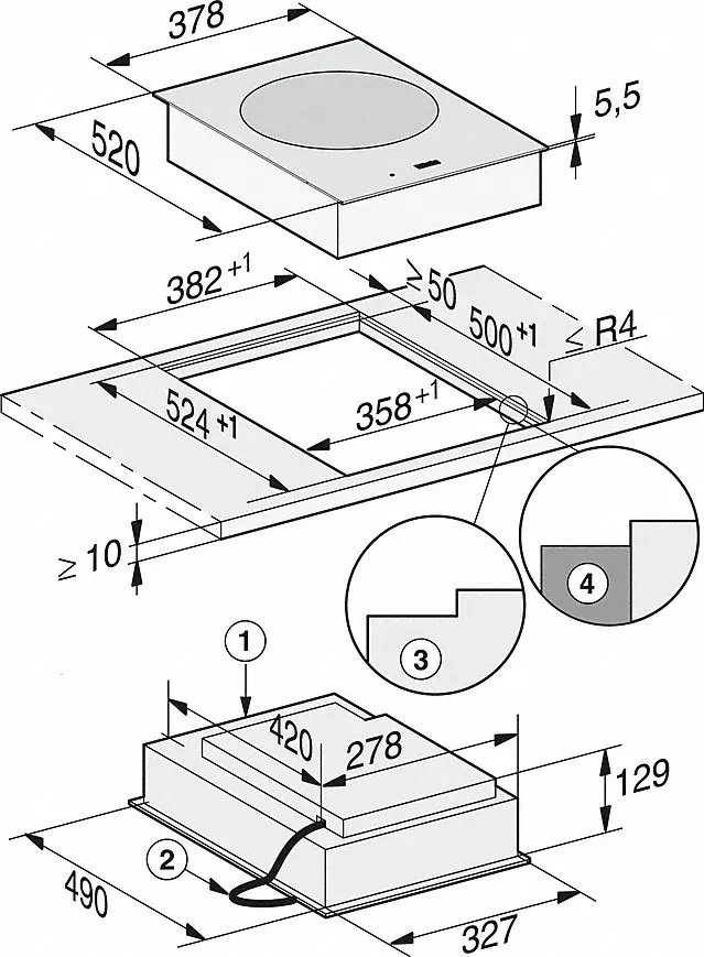 - In 378 mm Breite für flächenbündigen oder aufliegenden Einbau