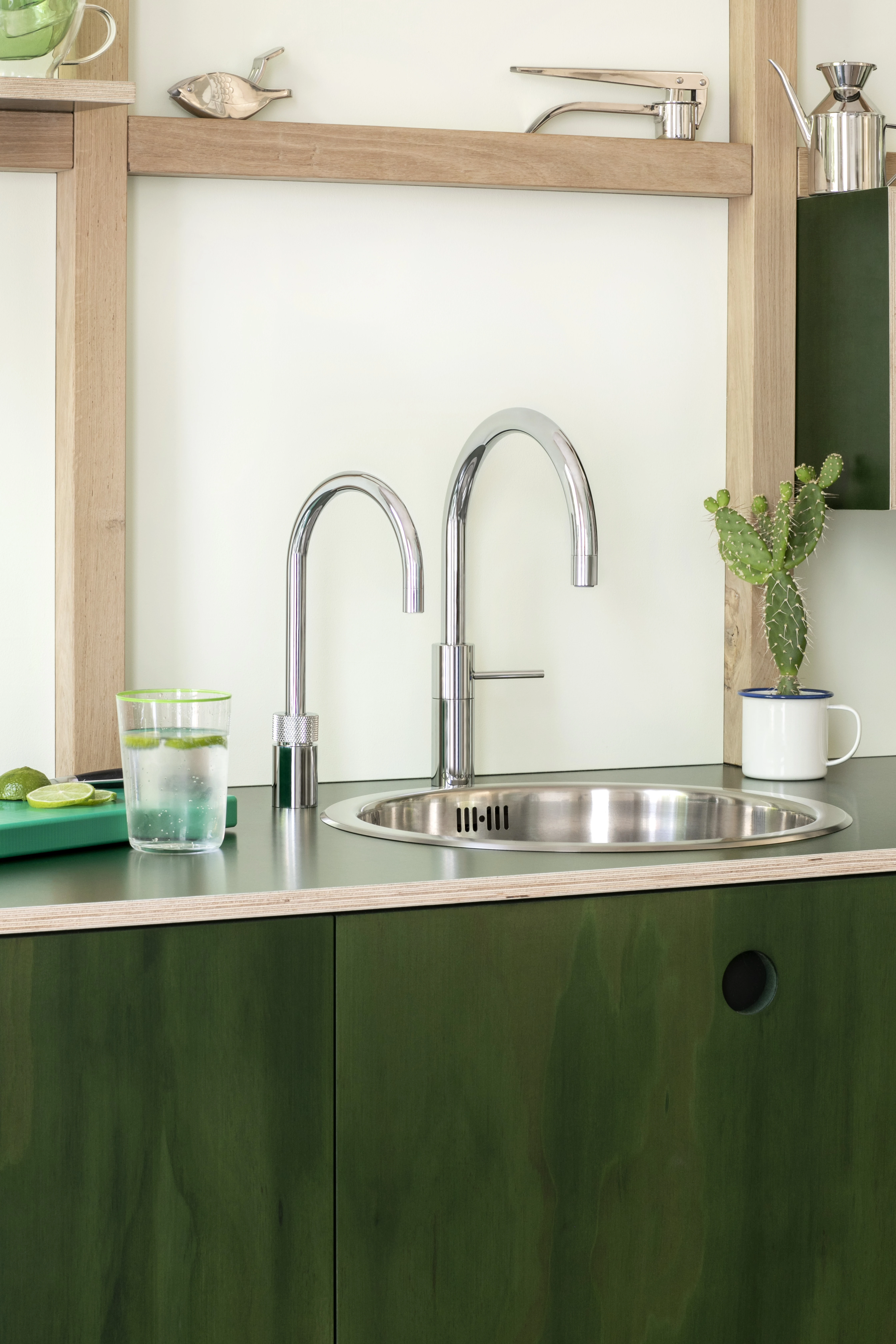 - Quooker bietet: einen höhenverstellbaren Hahn, dessen Auslauf genau über das zu befüllende Behältnis gedreht werden kann, wodurch er nicht spritzt