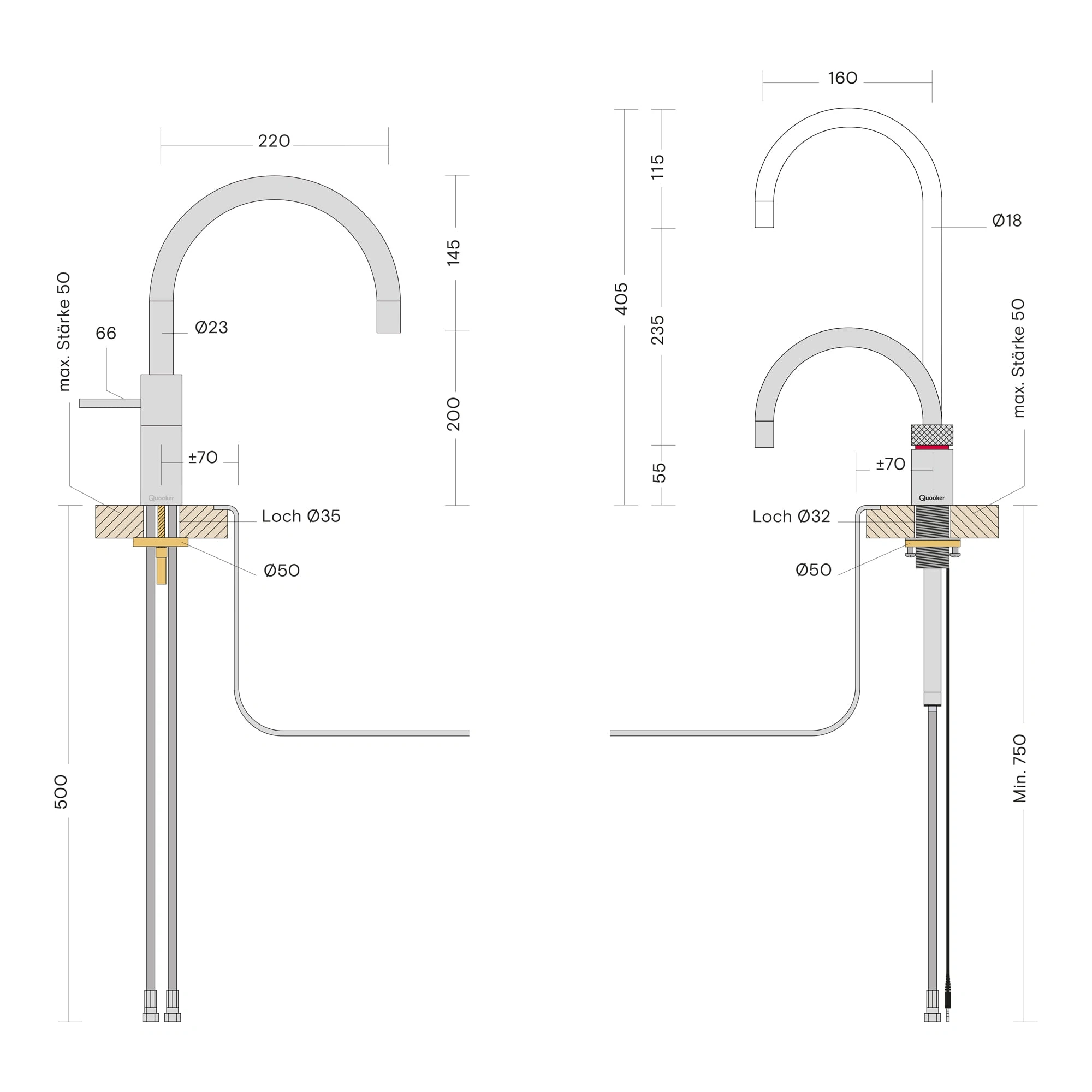 - Quooker bietet: einen höhenverstellbaren Hahn, dessen Auslauf genau über das zu befüllende Behältnis gedreht werden kann, wodurch er nicht spritzt