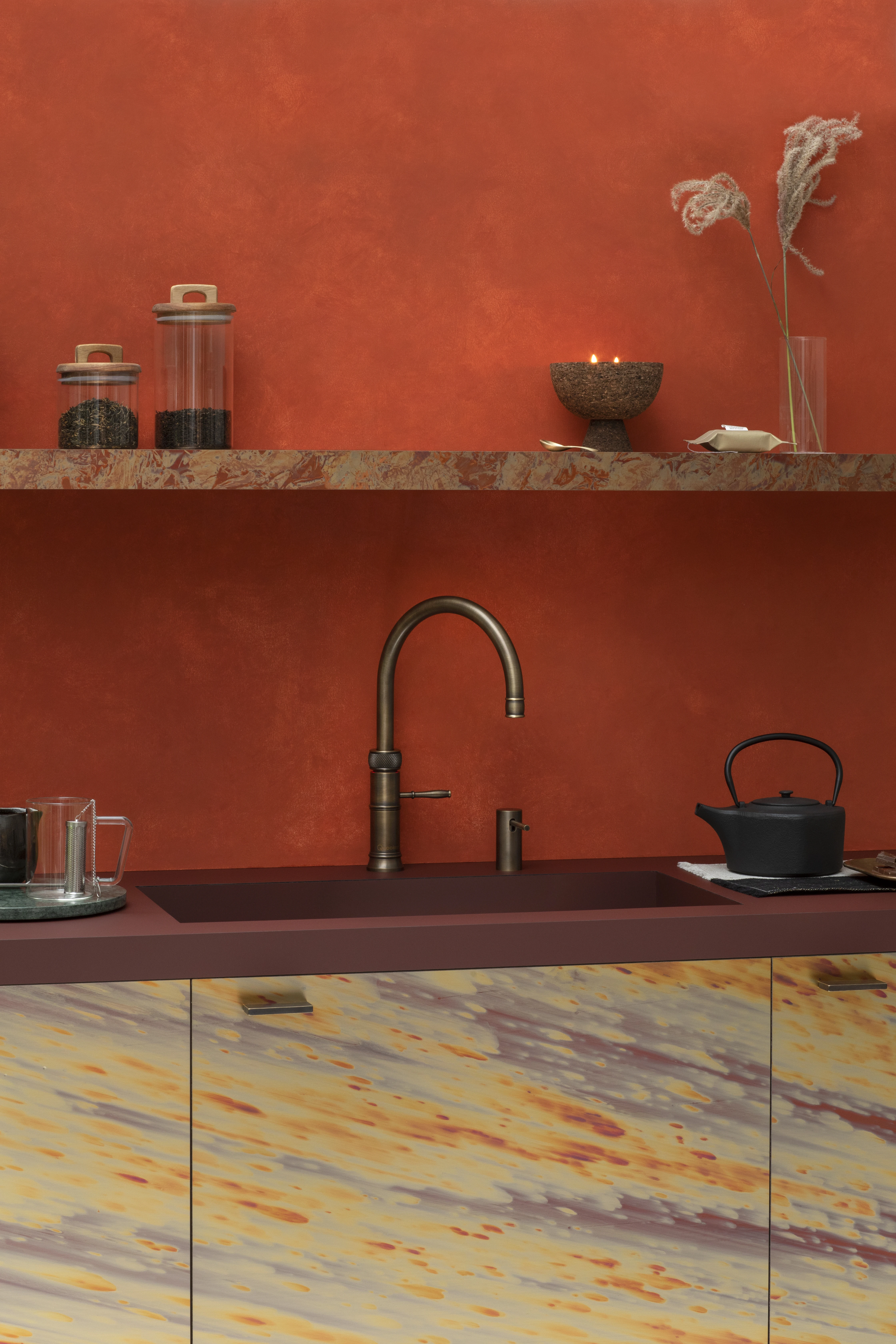 - Quooker bietet: einen höhenverstellbaren Hahn, dessen Auslauf genau über das zu befüllende Behältnis gedreht werden kann, wodurch er nicht spritzt