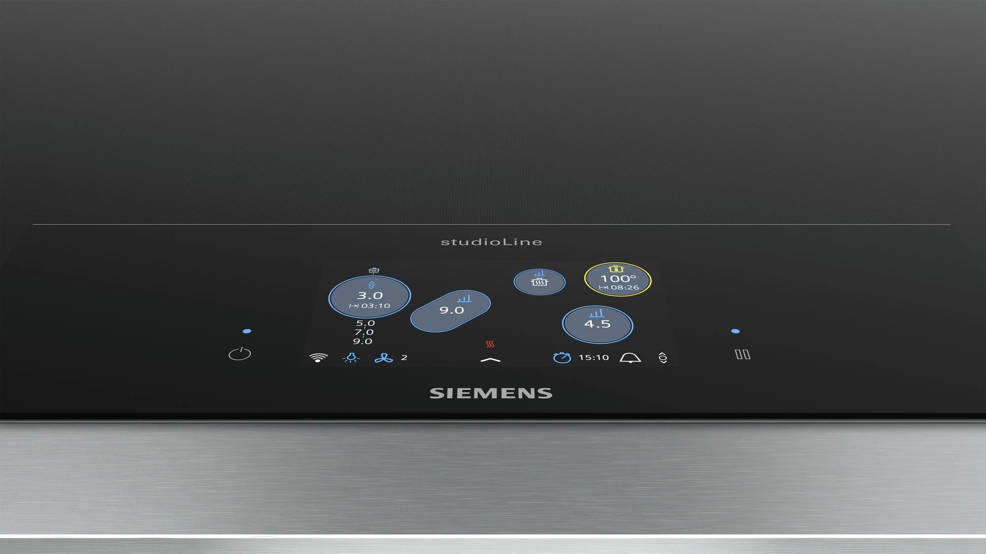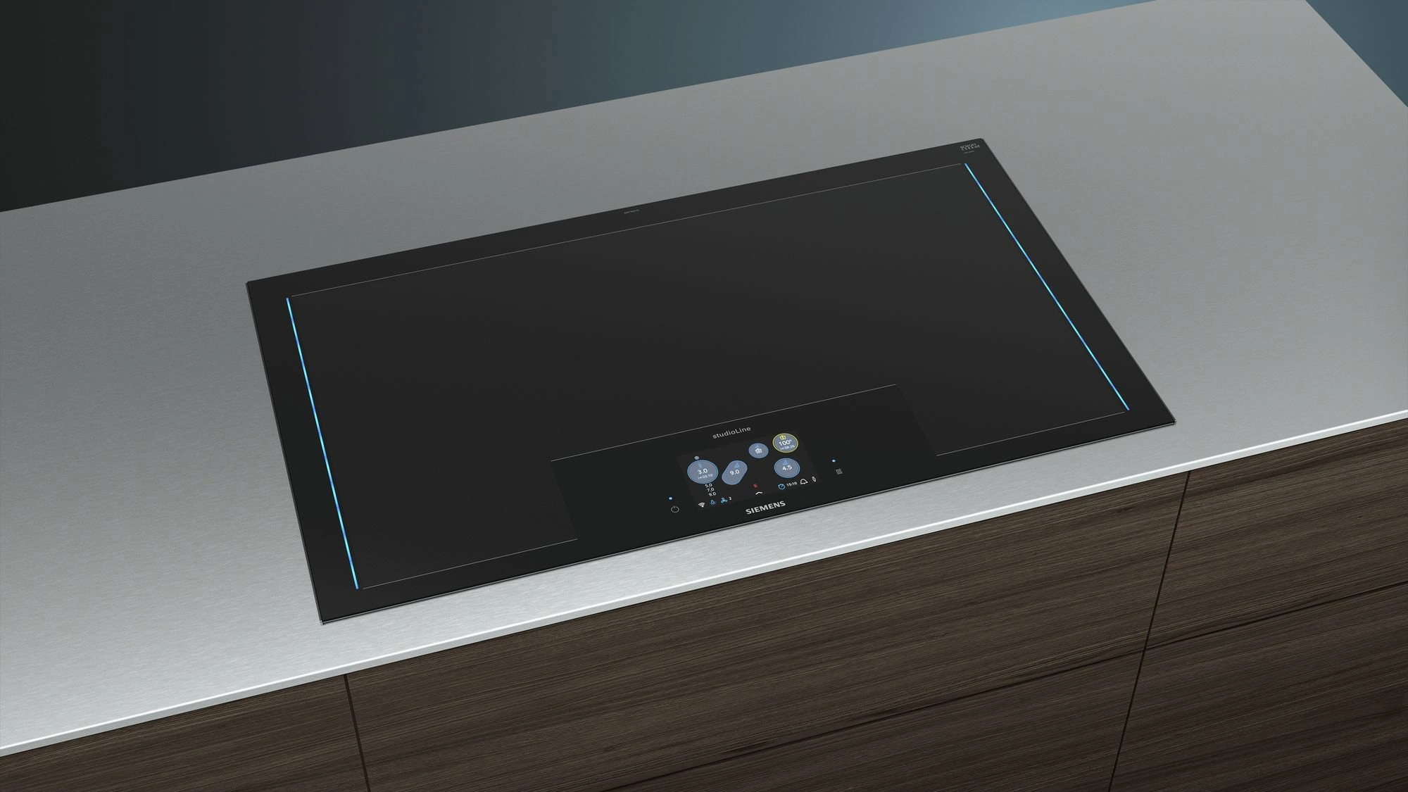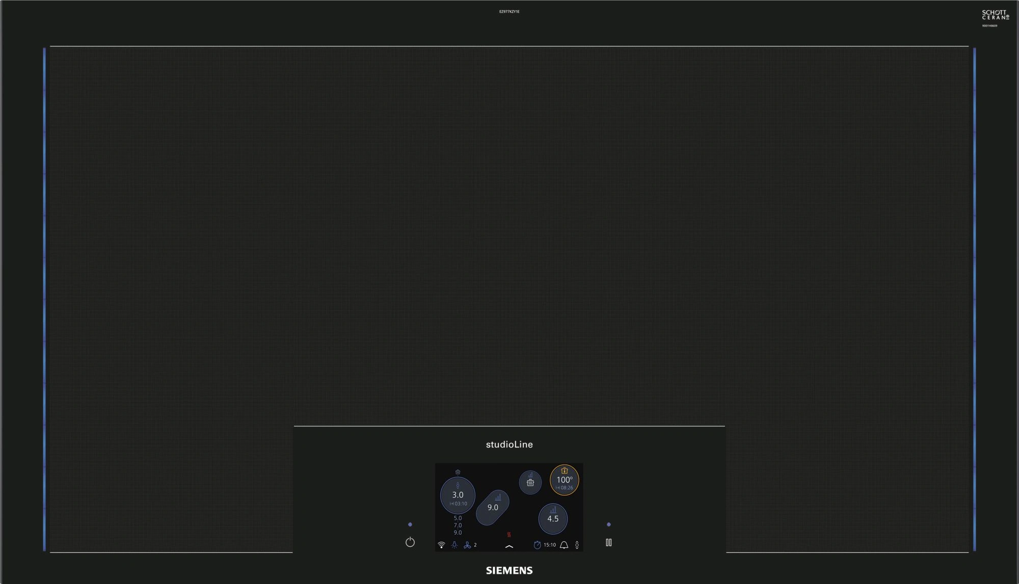 Das Siemens EZ977KZY1E iQ700 Induktionskochfeld aus der studioLine besitzt eine praktische Flächeninduktion mit freier Topfpositionierung auf 90 cm. Es wird mit einem Designrahmen in die Arbeitsplatte eingebaut. Die Bedienung erfolgt über ein modernes TFT-Touch Display mit farblicher Text-Symbol-Anzeige.
