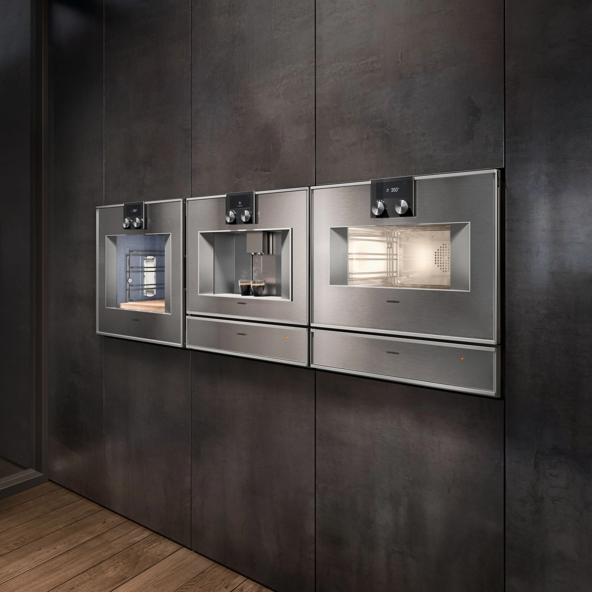 Der Gaggenau Serie 400 Kaffeevollautomat vereint modernes Design mit perfekter Profi Kochkunst. Die grifflose Vollglastür und silbern gebürstete Oberfläche aus Edelstahl bzw. dunklem Anthrazit treffen auf Highclass Funktionen und aromatischen Kaffeegenuss.