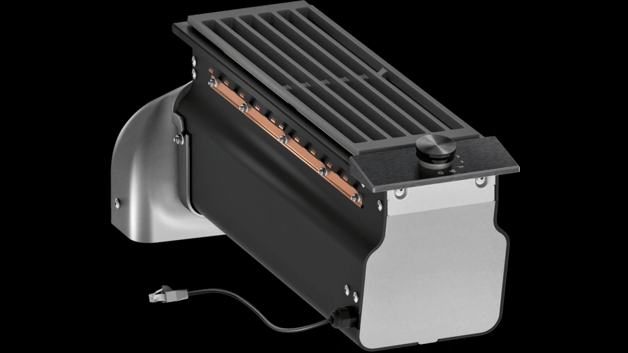 Die Gaggenau VL200120 Vario Muldenlüftung in 15 cm erscheint in dunklem Schwarz. Sie lässt sich ideal mit den Vario Serie 200 Kochfeldern kombinieren.
