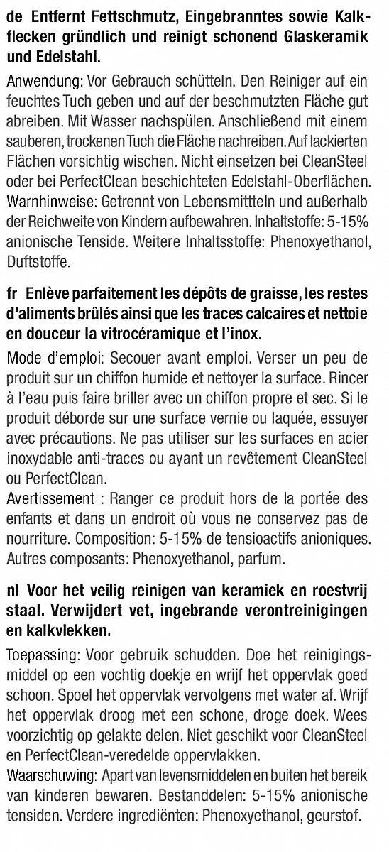 Mit dem Miele Reiniger für Glaskeramik und Edelstahl (GP CL KM 0252 L) beseitigen Sie effizient Fettschmutz, Eingebranntes und Wasserflecken in der Küche. Er ist besonders schonend zu den Geräten und hinterlässt einen Schutzfilm, der weitere Reinigungen erleichtert. Der Edelstahlreiniger ist für viele Glaskeramikkochfelder und Edelstahloberflächen geeignet, darf jedoch nicht bei CleanSteel und PerfectClean-Oberflächen eingesetzt werden.