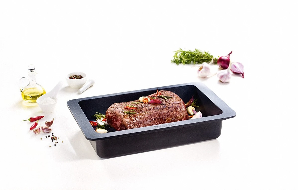 - Einsetzbar in Backöfen, auf Kochfeldern außer Induktion und Gas
