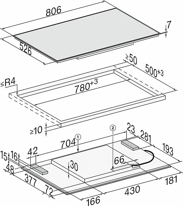 - In 806 mm Breite mit Edelstahlrahmen für aufliegenden Einbau