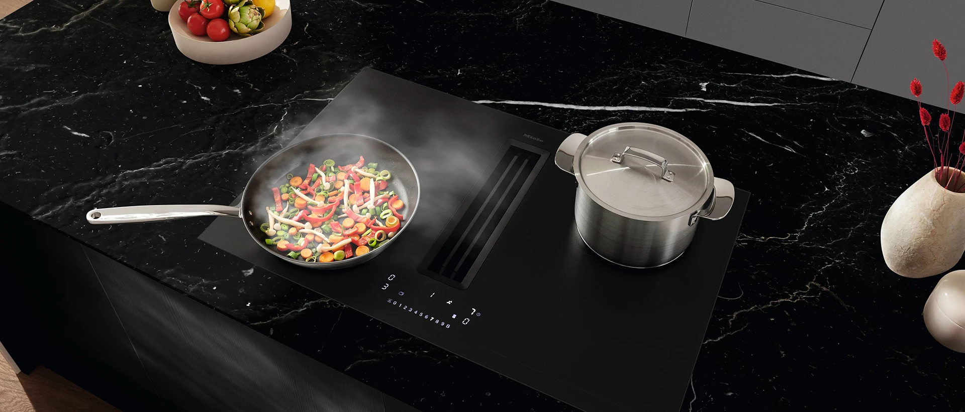 Individuelles Küchendesign: Dank der einheitlichen Tiefe harmonieren unsere Miele Kochfelder besonders gut mit den eleganten Miele SmartLine-Elementen. Vielfältige Kombinationsmöglichkeiten sorgen dabei für eine Küchengestaltung ganz nach Ihrem persönlichen Geschmack. Die 60 cm Miele Induktionskochfelder sind zudem problemlos mit dem Miele Tischlüfter CSDA 7000 nutzbar – hier trifft intelligente Technologie auf edles Design.