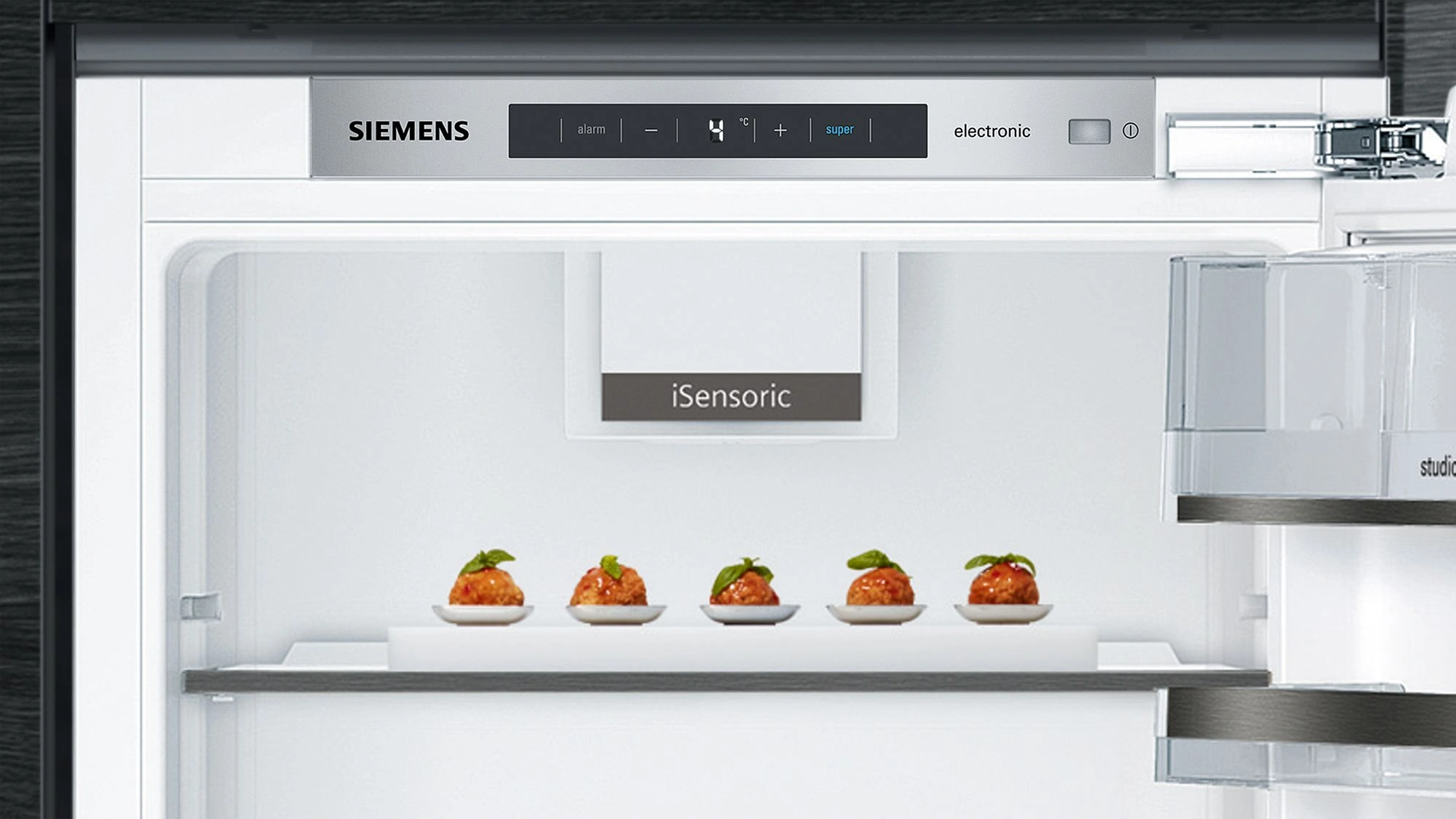 Der Siemens KI81RSOE0 iQ500 Kühlschrank ist ein smarter Einbaukühlschrank aus der studioLine, der sich über openAssist einfach über Sprache öffnen lässt. Auf 319 Liter bietet er die optimale Lagerung für frische Lebensmittel. Das hyperFresh Plus 0°C System hält Obst und Gemüse 2x länger frisch und knackig. Flaschen lagern rutschsicher auf der bottleRack Flaschenablage. Das Ein- und Ausräumen ist durch bewegliche Glasablagen mit easyAccess vereinfacht.
