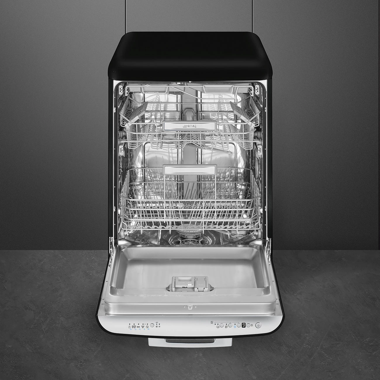 50's Style ist eine Retro Design-Serie von Smeg, die sich durch kurvenreiche Formen und lebhafte Farben auszeichnet. Espressomaschine, Küchenmaschine, Kühlschrank, Dunstabzugshaube, Mixer, Wasserkocher und Toaster erscheinen im Stil der 50er Jahre. Smeg 50's Style Geschirrspüler sind Made in Italy und verkörpern italienisches Design plus technische Spitzenleistung.