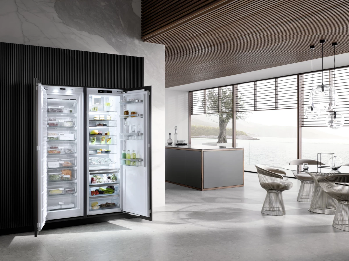 Miele K 7773 D ist ein Einbau-Kühlschrank mit Festtür zur Integration in den Küchenschrank. Er verfügt über 296 Liter Volumen, 7 Ablageflächen (davon vier mit smarter FlexiLight 2.0 Glasbodenbeleuchtung), 1 Flaschenablage aus Metall, 3 Frischeschubladen und 4 Innentürabsteller. Funktionen wie CleanSteal (trockene Rückwand), DynaCool (gleichmäßige Temperaturverteilung) und PerfectFresh Active (bis zu 5x längere Frische bei Obst und Gemüse durch Befeuchtung durch einen Frischenebel) gehören ebenfalls zur Ausstattung. Zudem lässt sich der Kühlschrank smart bedienen mit Miele@home.