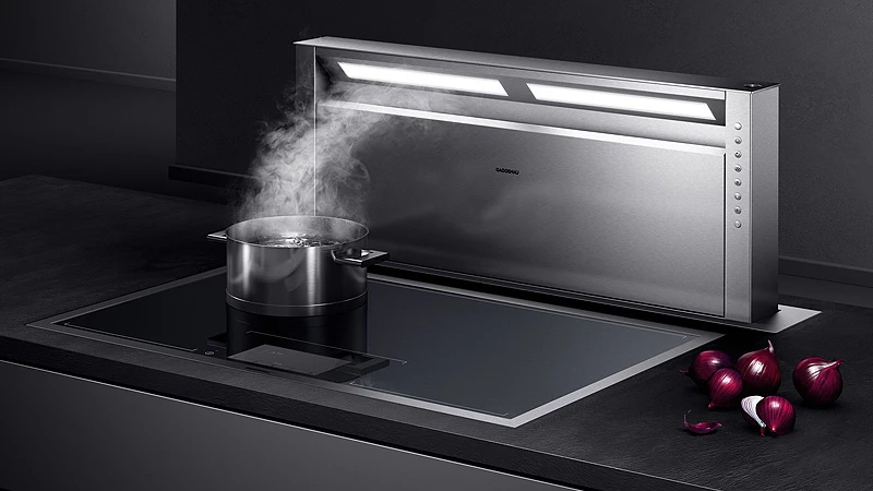 As the kitchen becomes a space for living, good ventilation becomes increasingly important. Effortless, quiet, and intelligent—the ventilation devices in Series 400 and 200 encompass a range of different ventilation systems with manual or automatic control for installation on the ceiling, wall, kitchen cabinet, over your cooktop, or on the cooktop itself. The key design requirements were discreet operation and optimized airflow, resulting in a system that operates quietly and powerfully in the background.