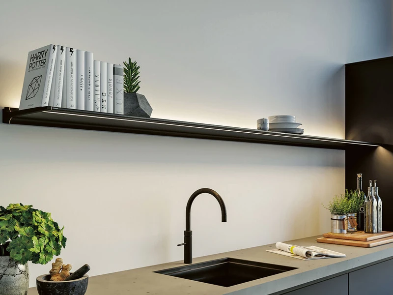 Under-cabinet lights, plinth lighting, display lights – for the kitchen there's plenty of lighting that transforms this room into a perfectly illuminated cooking zone.