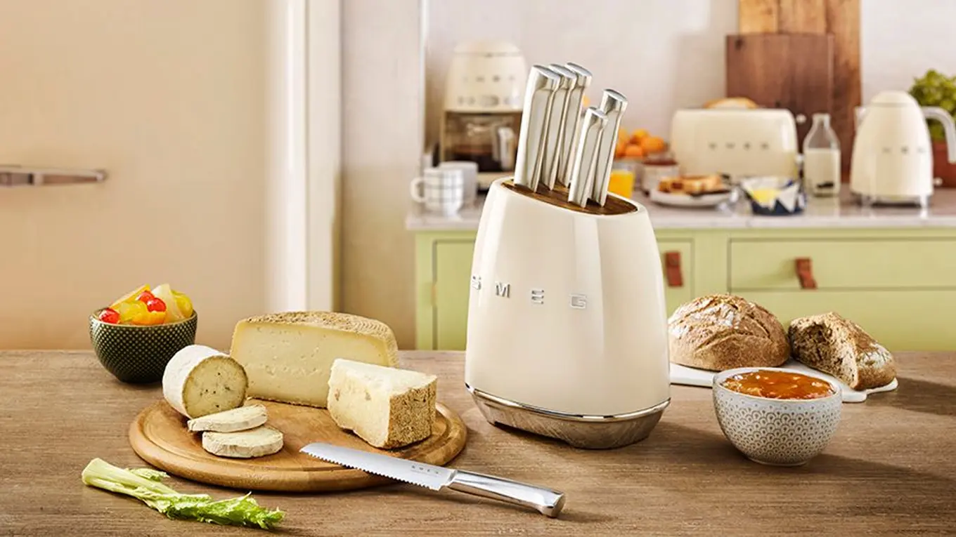 Give the gift of a 1950s-style Smeg knife block! The robust knife holder made of powder-coated carbon steel with acacia wood slots ensures secure storage and gives the kitchen a stylish, harmonious overall look in various pastel colors such as cream, black, or pastel blue.