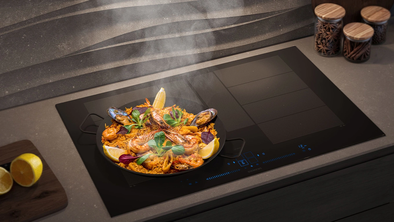The Siemens induction cooktop is a flexible cooking zone that easily accommodates roasting pans and griddles. Thanks to innovative technologies such as powerMove Plus, different temperature ranges can be controlled simply by moving the pans – intuitively, quickly, and energy-efficiently.