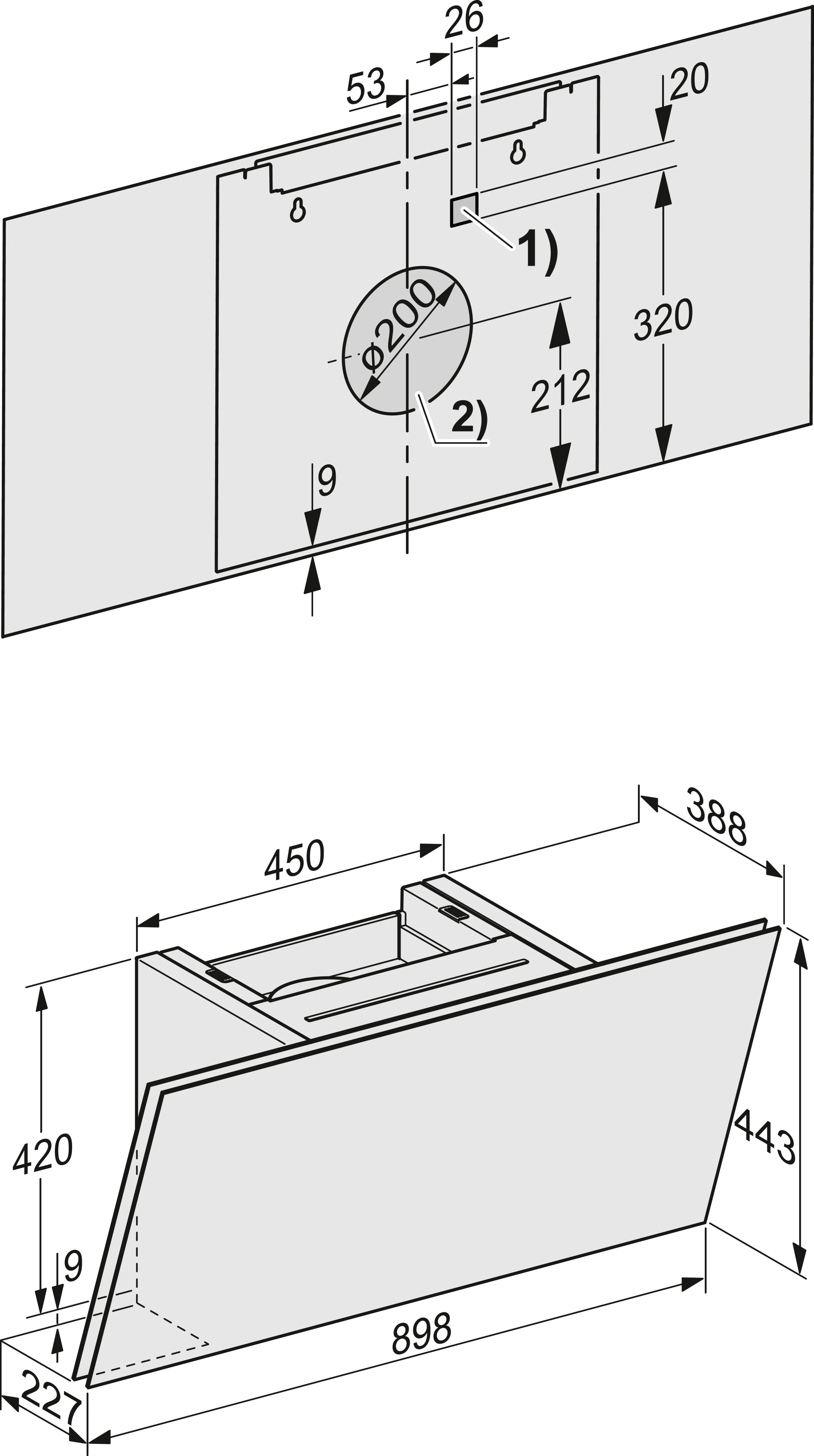 - Kopffreiheit - mit Glasschirm in 898 mm Breite