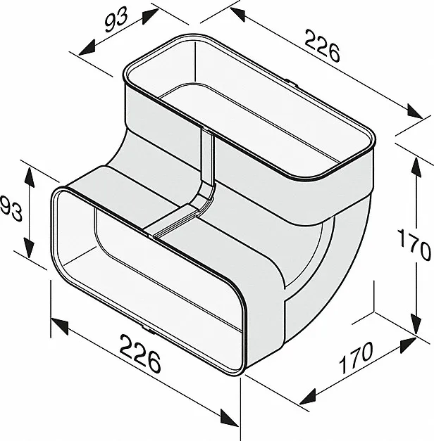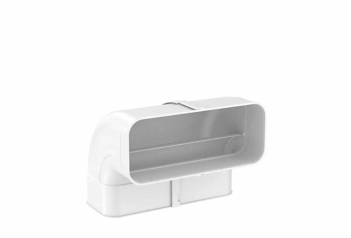 Miele DFK-BV 90 ist ein vertikaler Flachkanalbogen mit 90° Winkel und 170 mm Tiefe/Höhe. Er sorgt für eine hygienische Entlüftung im Abluft- und Umluft-Betrieb der Dunstabzugshaube und besteht aus weißem, schwer entflammbarem Kunststoff.