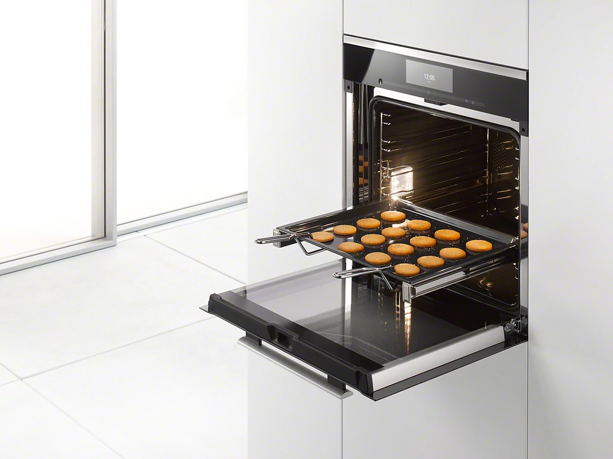 Miele HEG ist ein praktischer Entnahmegriff für heiße Bleche und Roste aus dem Backofen. Das Zubehör unterstützt schwere Bleche direkt am Schwerpunkt.