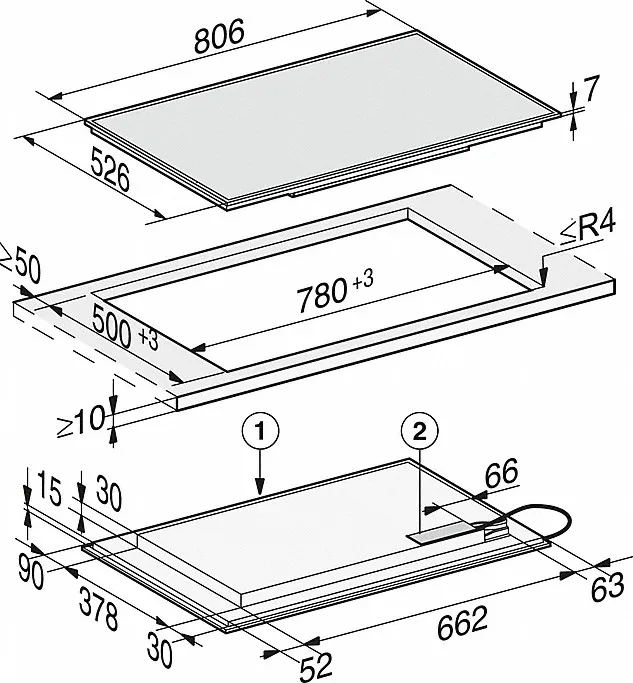 - In 806 mm Breite mit Edelstahlrahmen für aufliegenden Einbau