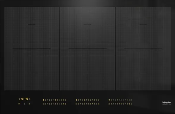 Miele KM 7575 FR ist ein autarkes (herdunabhängiges) Induktionskochfeld aus schwarzer Glaskeramik. Es verfügt über drei PowerFlex-Bereiche mit Flex-Induktion (6 Kochzonen) und TwinBooster. Das Miele Kochfeld mit Induktion in 806 mm wird aufliegend mit Edelstahlrahmen in die Arbeitsplatte eingebaut. Die Bedienung erfolgt über SmartSelect - Zahlenreihen mit Touch und gelber Anzeige. Zudem lässt sich das Kochfeld smart steuern via Miele@home und mit Con@ctivity mit der Dunstabzugshaube verbinden.