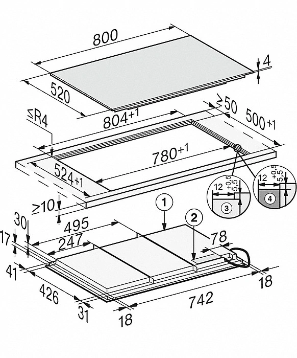 - Rahmenlos für flächenbündigen oder aufliegenden Einbau