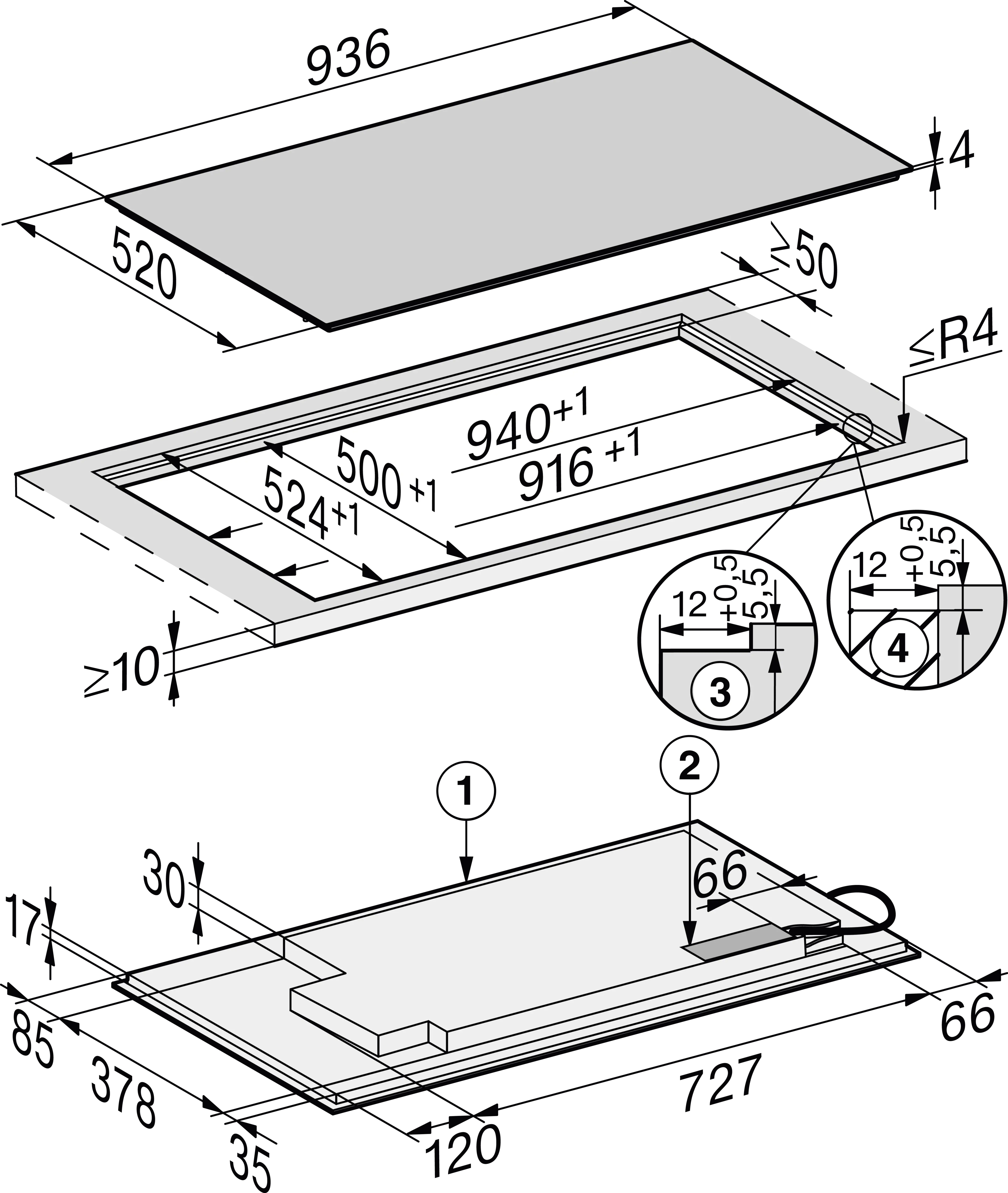 - In 936 mm Breite für flächenbündigen oder aufliegenden Einbau