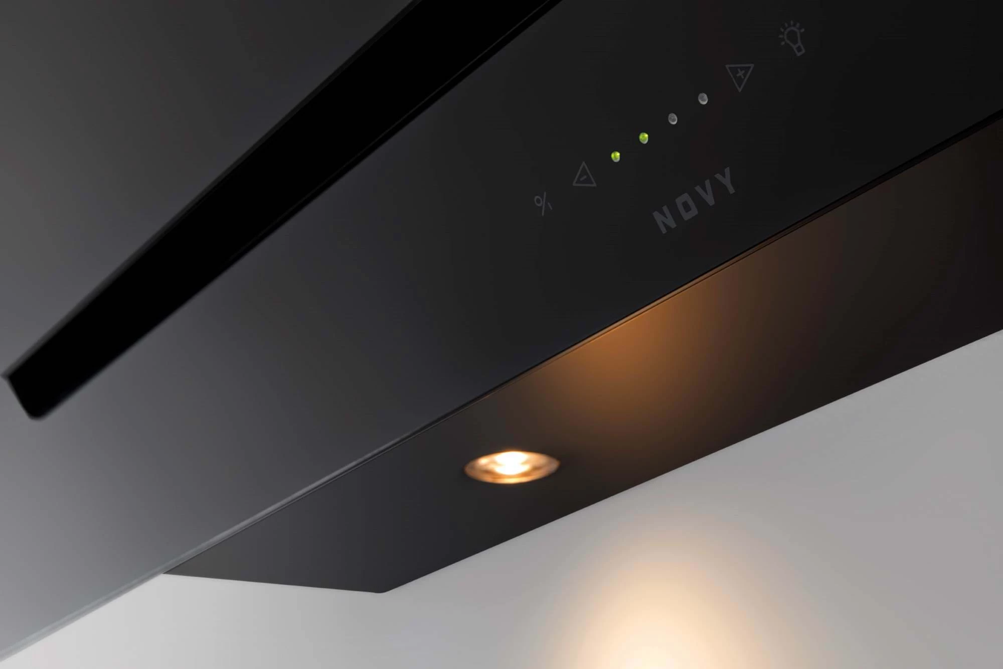 Novy Vision 7853 ist eine moderne Kopffreihaube aus schwarzem Glas in 75 cm Breite. Die Wand-Dunstabzugshaube überzeugt mit ihrem modernen Look und suptiler LED-Beleuchtung.