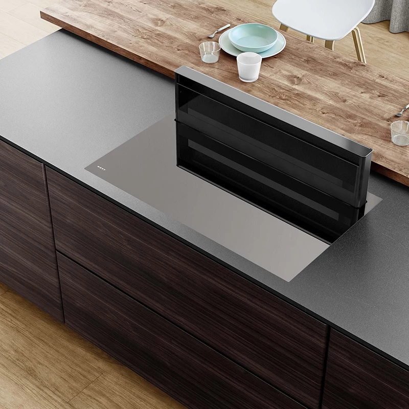 Innovative cooktop extractor with a centrally positioned extraction tower at the back, which rises from the cooktop during cooking and disappears afterwards: Novy Panorama is an elegant extraction solution for open kitchens.