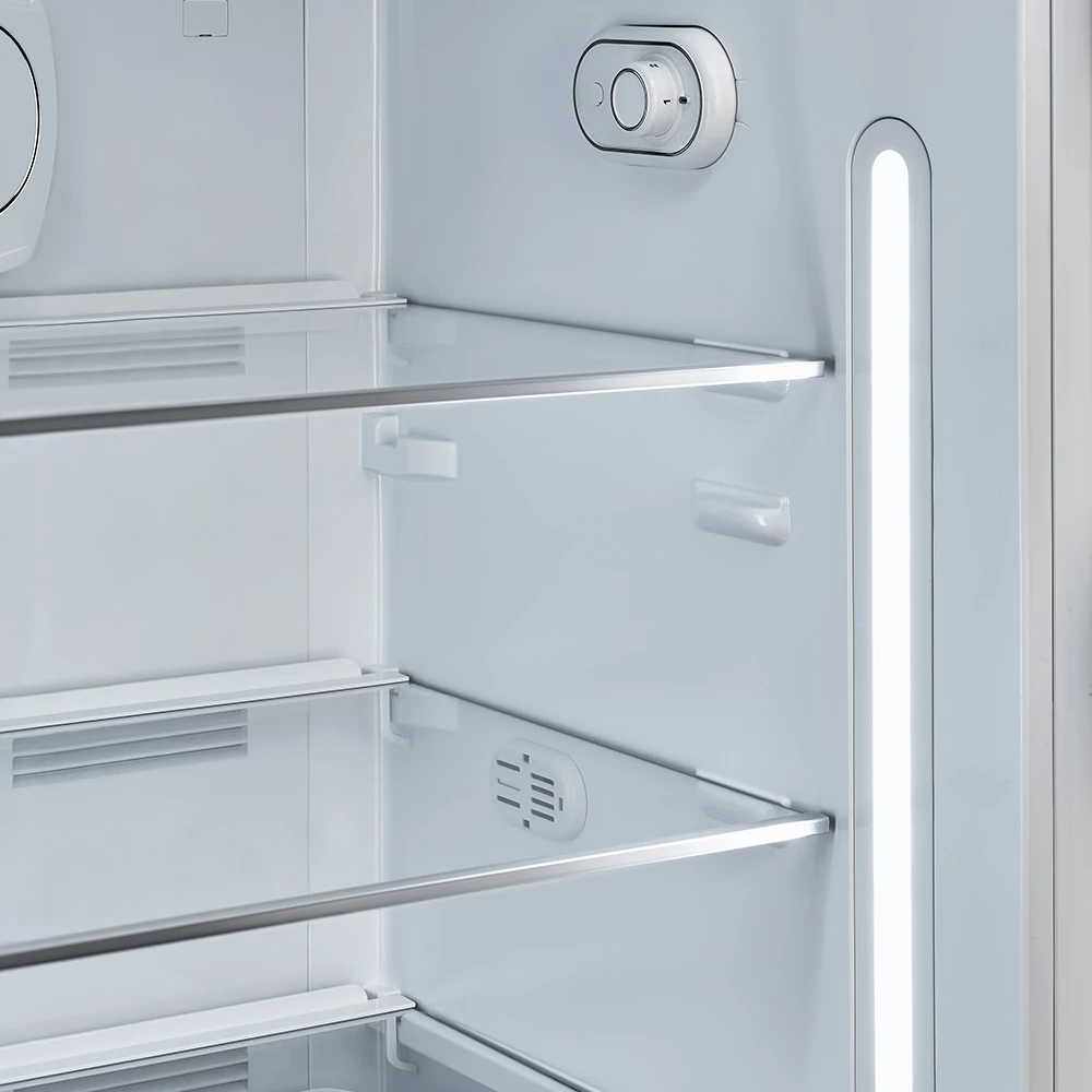50's Style ist eine Retro Design-Serie von Smeg, die sich durch kurvenreiche Formen und lebhafte Farben auszeichnet. Espressomaschine, Küchenmaschine, Kühlschrank, Dunstabzugshaube, Mixer, Wasserkocher und Toaster erscheinen im Stil der 50er Jahre. Smeg 50's Style Kühlschränke sind Made in Italy und verkörpern italienisches Design plus technische Spitzenleistung.