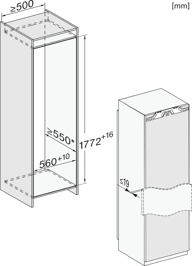Miele K 7773 D ist ein Einbau-Kühlschrank mit Festtür zur Integration in den Küchenschrank. Er verfügt über 296 Liter Volumen, 7 Ablageflächen (davon vier mit smarter FlexiLight 2.0 Glasbodenbeleuchtung), 1 Flaschenablage aus Metall, 3 Frischeschubladen und 4 Innentürabsteller. Funktionen wie CleanSteal (trockene Rückwand), DynaCool (gleichmäßige Temperaturverteilung) und PerfectFresh Active (bis zu 5x längere Frische bei Obst und Gemüse durch Befeuchtung durch einen Frischenebel) gehören ebenfalls zur Ausstattung. Zudem lässt sich der Kühlschrank smart bedienen mit Miele@home.