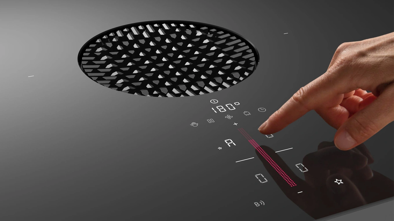 Zentral unterhalb des runden Dunstabzugs befindet sich die intuitive Touch Bedienung mit Slider (BORA sControl). Weiß-blaue Farbanzeigen in einem hell-dunkel-Kontrast sorgen für eine moderne Optik. Im Stand-by-Modus wird der Slider zudem auch noch nahezu unsichtbar. Relevante Elemente leuchten heller, irrelevante dunkler. Nicht verwendete oder verfügbare Funktionen werden gänzlich ausgeblendet.