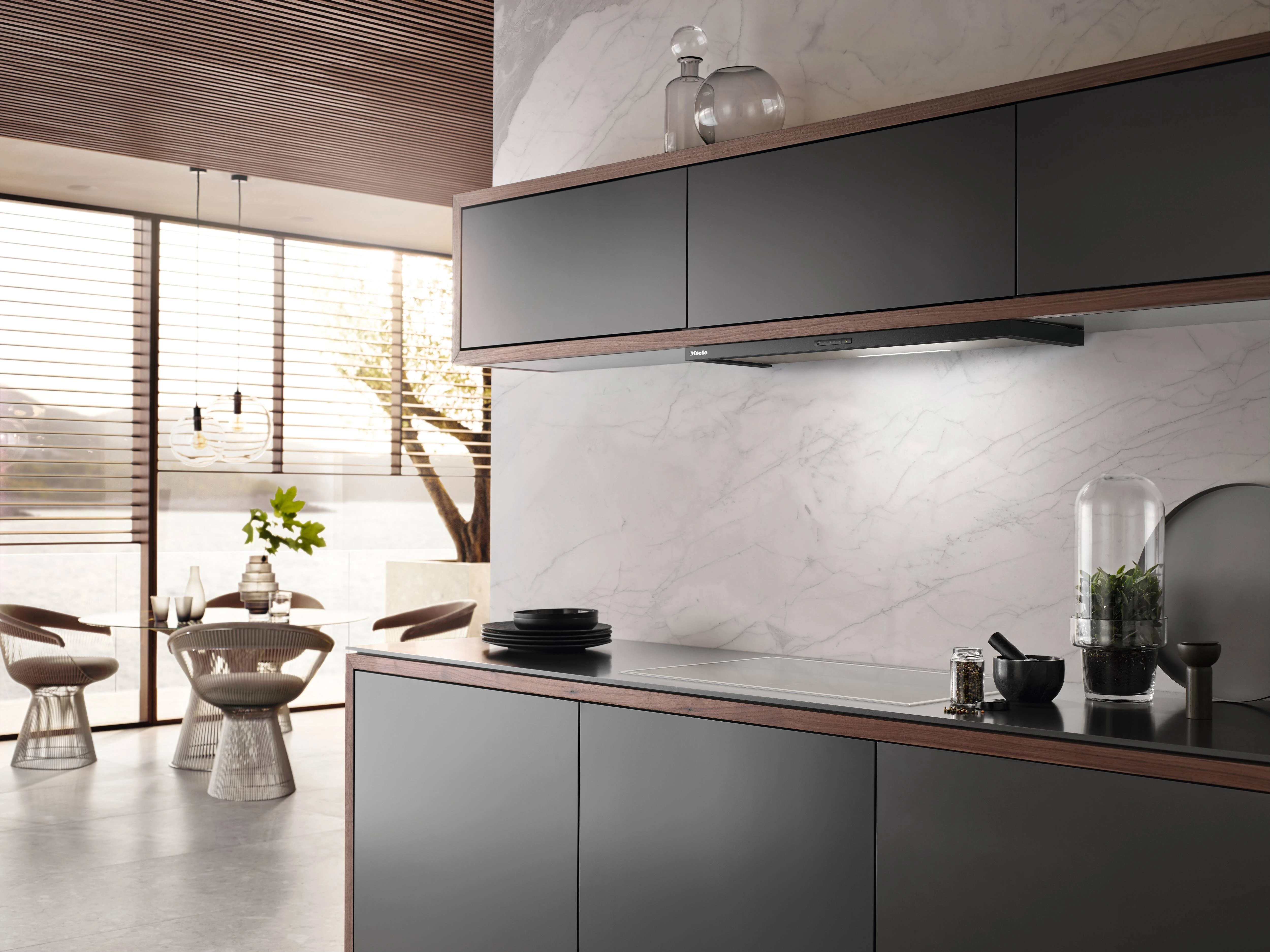 - Elegantes Design – mattschwarze Bedienblende in 90cm Breite