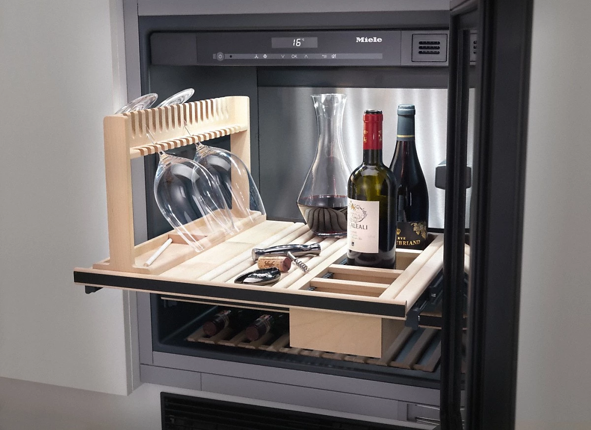 Miele KWT 6312 UGS ist ein Unterbau-Weintemperierschrank zum Einbau in den Küchenschrank. Der Weinschrank besitzt eine Temperaturzone (5-20°C) und bietet Platz zur vibrationsarmen Aufbewahrung von 46 Weinflaschen auf 110 Liter Volumen. Zur Lagerung werden die Flaschen auf das Holzboard aus Buche gelegt oder auf dem SommelierSet präsentiert. Besonders praktisch ist das Miele FlexiFrame. Durch herausnehmbare Stege lassen sich auch große Weinflaschen ideal lagern. Weitere Highlights vom Weinkühlschrank sind die getönte Glasfront mit UV-Filter, der Active AirClean Filter für Geruchsbindung und die smarte Steuerungsoption via Miele@home.