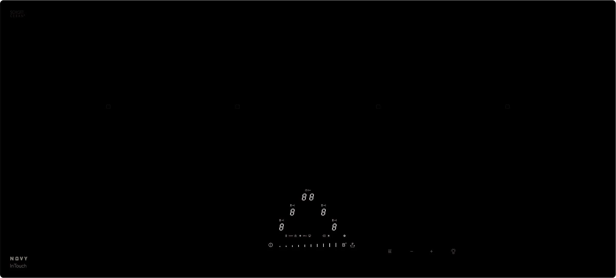 Novy Pro 1777 ist ein 90 cm Induktionskochfeld mit vier achteckigen Kochzonen, inklusive Flex-Induktion. Je zwei Zonen lassen sich zu einer großen Kochfläche zusammenschalten. Die Bedienung erfolgt über Touch Slider mit weißer Anzeige. Mit InTouch lässt sich auch die Dunstabzugshaube über das Kochfeld steuern.