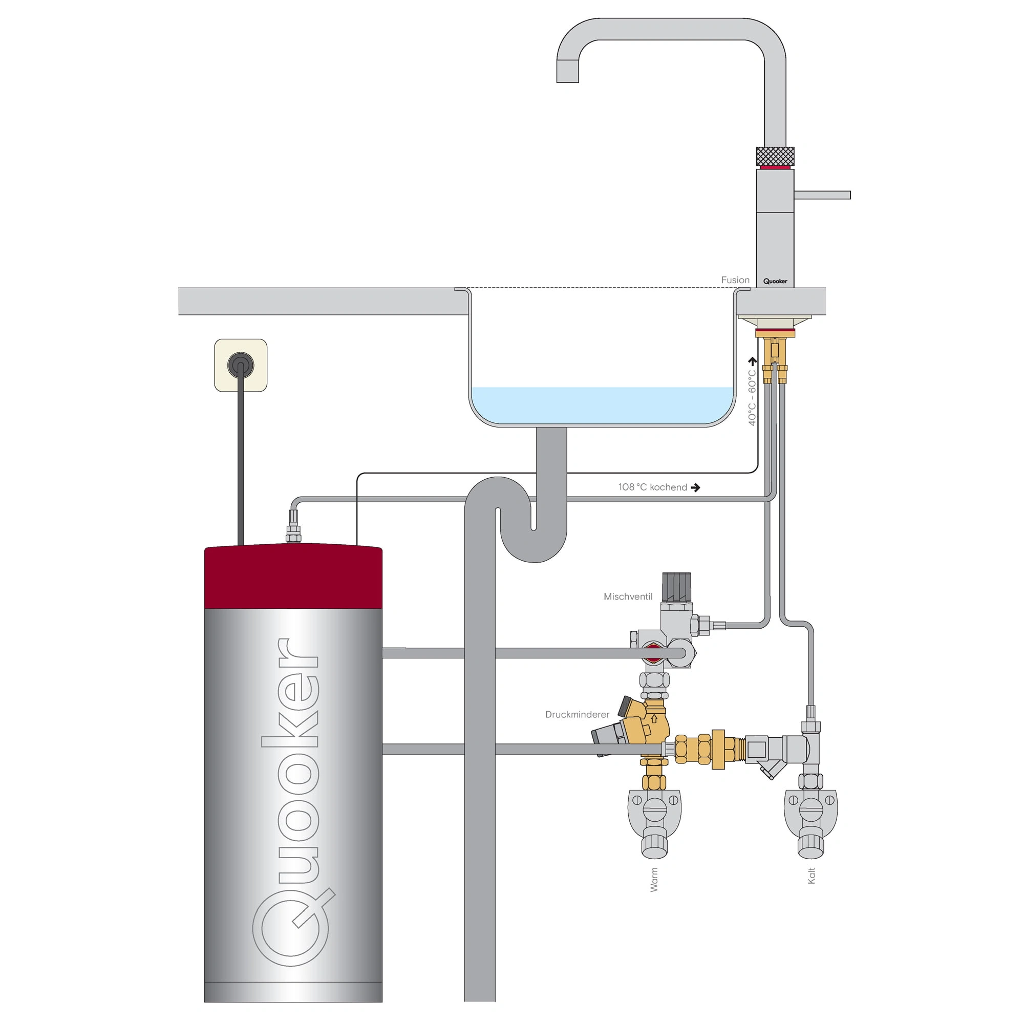 - Quooker bietet: einen höhenverstellbaren Hahn, dessen Auslauf genau über das zu befüllende Behältnis gedreht werden kann, wodurch er nicht spritzt