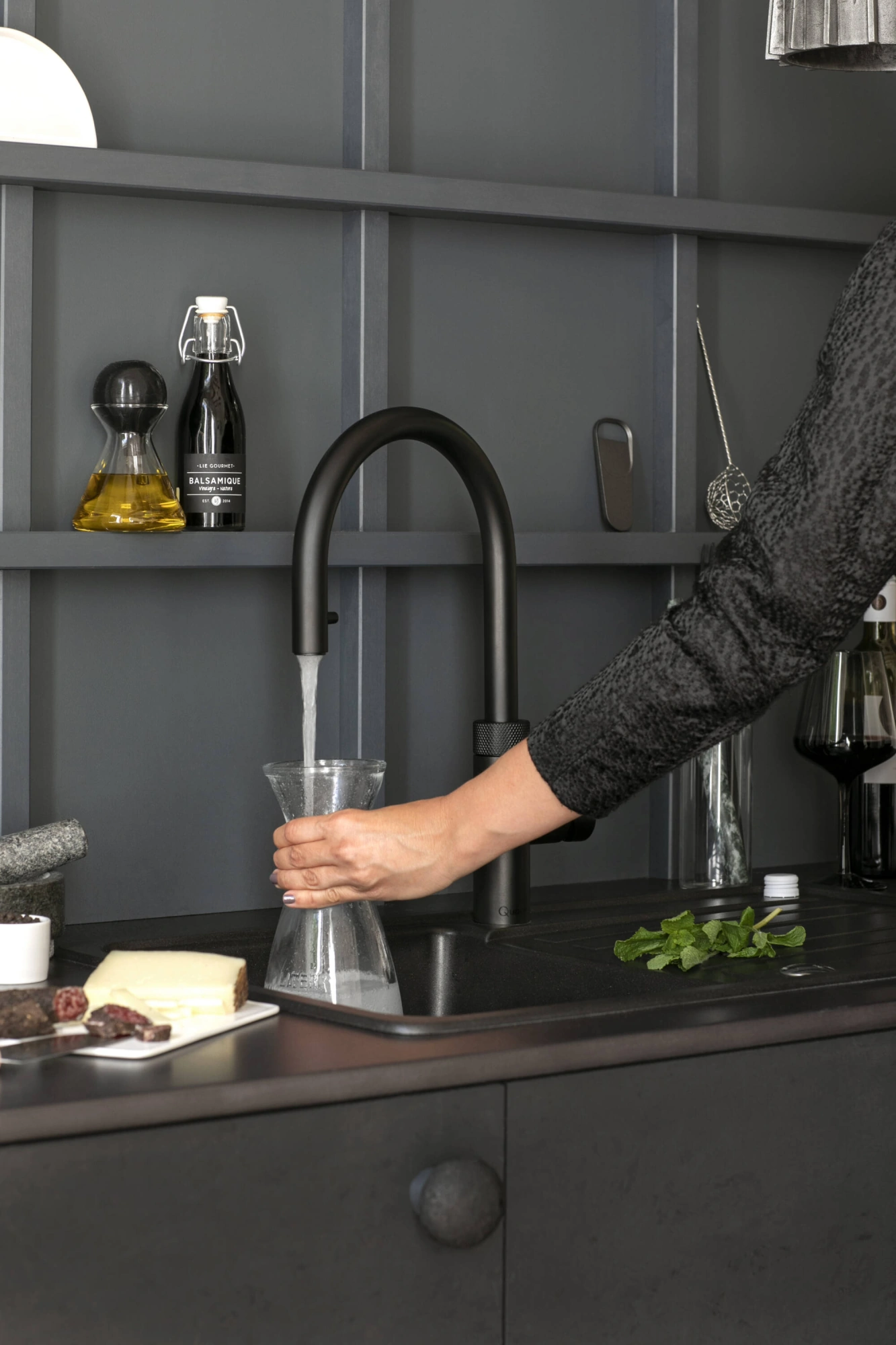 Quooker Flex 3XBLKCUBE ist ein Kochend Wasserhahn mit dem Pro3 Reservoir & dem CUBE Reservoir in der Variante Schwarz mit Zugauslauf. Das Design ist rund und zeitlos und fügt sich ideal in jeden Küchen-Stil ein. Die Quooker Flex Armatur 3XBLKCUBE ist ideal für verschiedenste Wassersorten in einer All-in-One-Lösung: kochendes Wasser mit einer Temperatur von 100° Celsius, kaltes Wasser, gefiltertes Wasser, stilles Wasser und kaltes sprudelndes Wasser - alles aus einem einzigen Auslauf. Welches Wasser aus dem Wasserhahn läuft, erkennt man am integrierten Leuchtring. Leuchtet er rot, kommt kochendes Wasser aus dem Wasserhahn. Blinkt er blau, kommt sprudelndes Wasser. Hält man ihn länger gedrückt, bleibt der Leuchtring am Quooker blau und es kommt stilles Wasser.