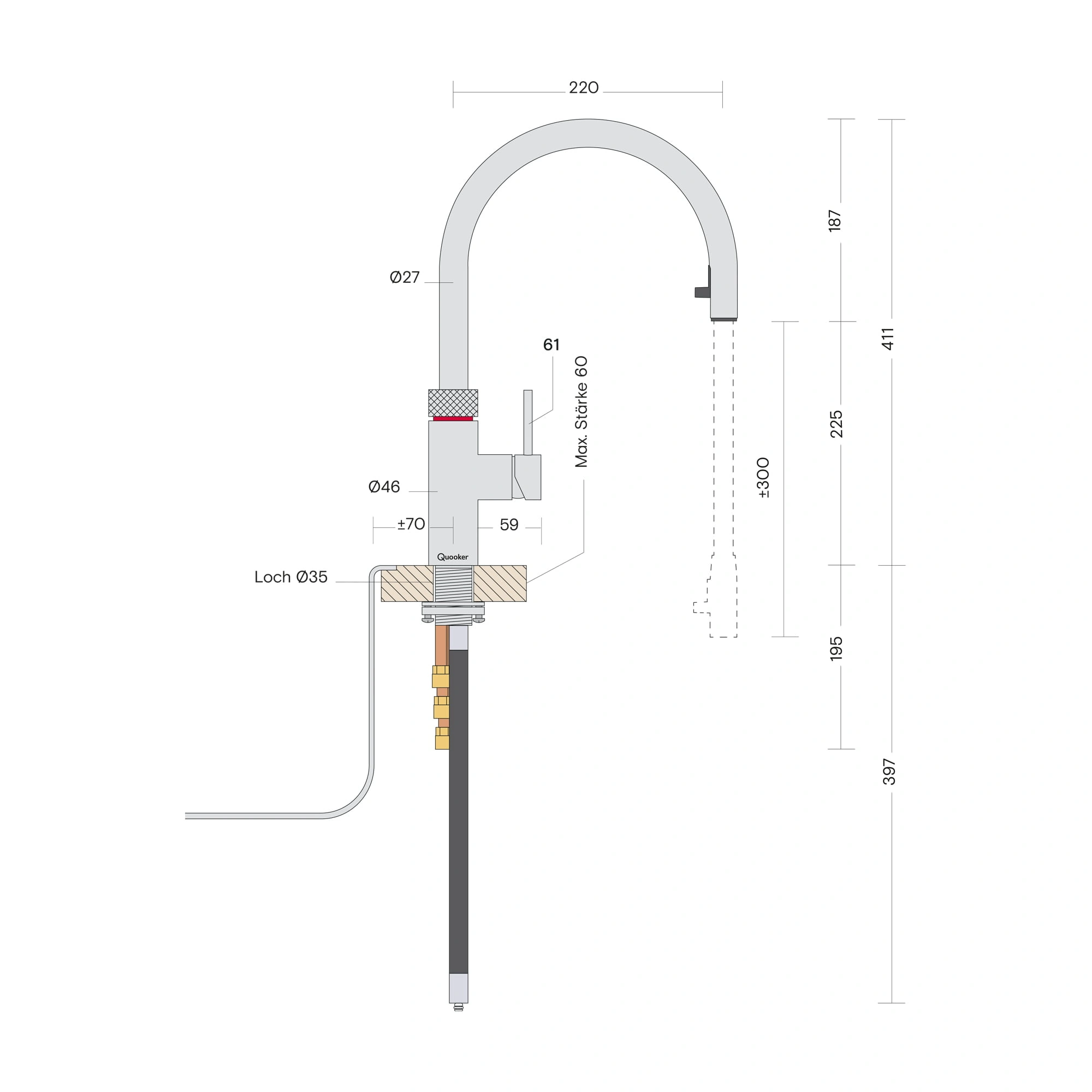 - Quooker bietet: einen höhenverstellbaren Hahn, dessen Auslauf genau über das zu befüllende Behältnis gedreht werden kann, wodurch er nicht spritzt