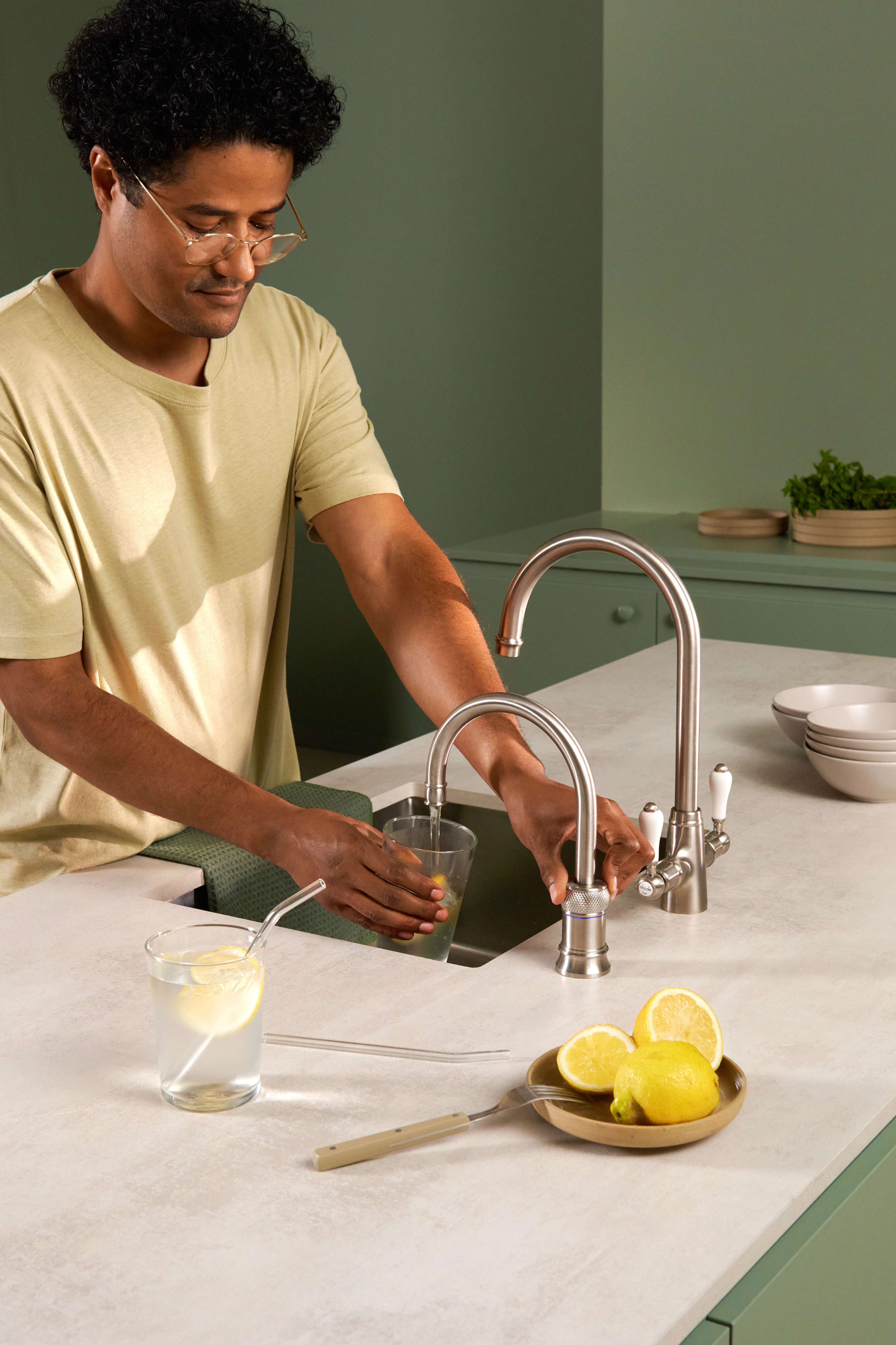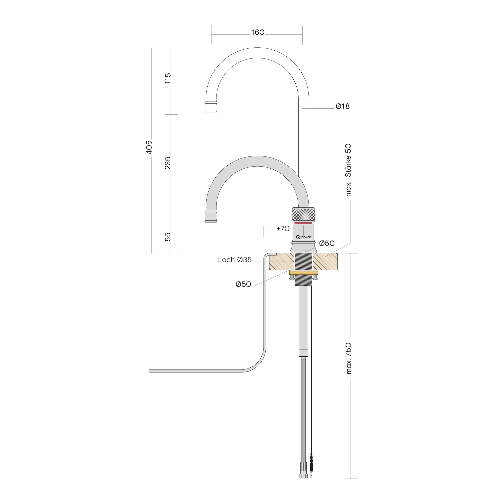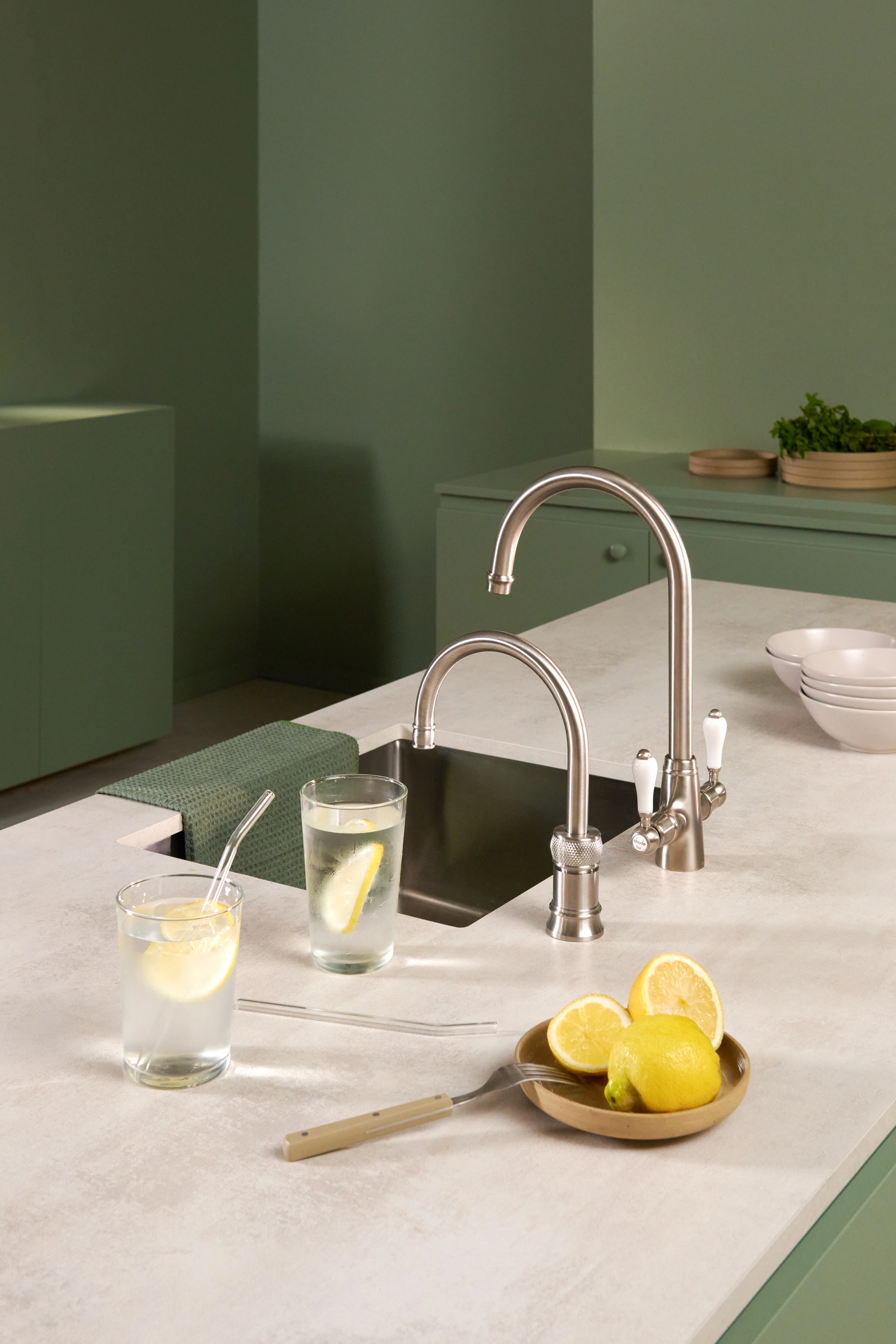 - Quooker bietet: einen höhenverstellbaren Hahn, dessen Auslauf genau über das zu befüllende Behältnis gedreht werden kann, wodurch er nicht spritzt