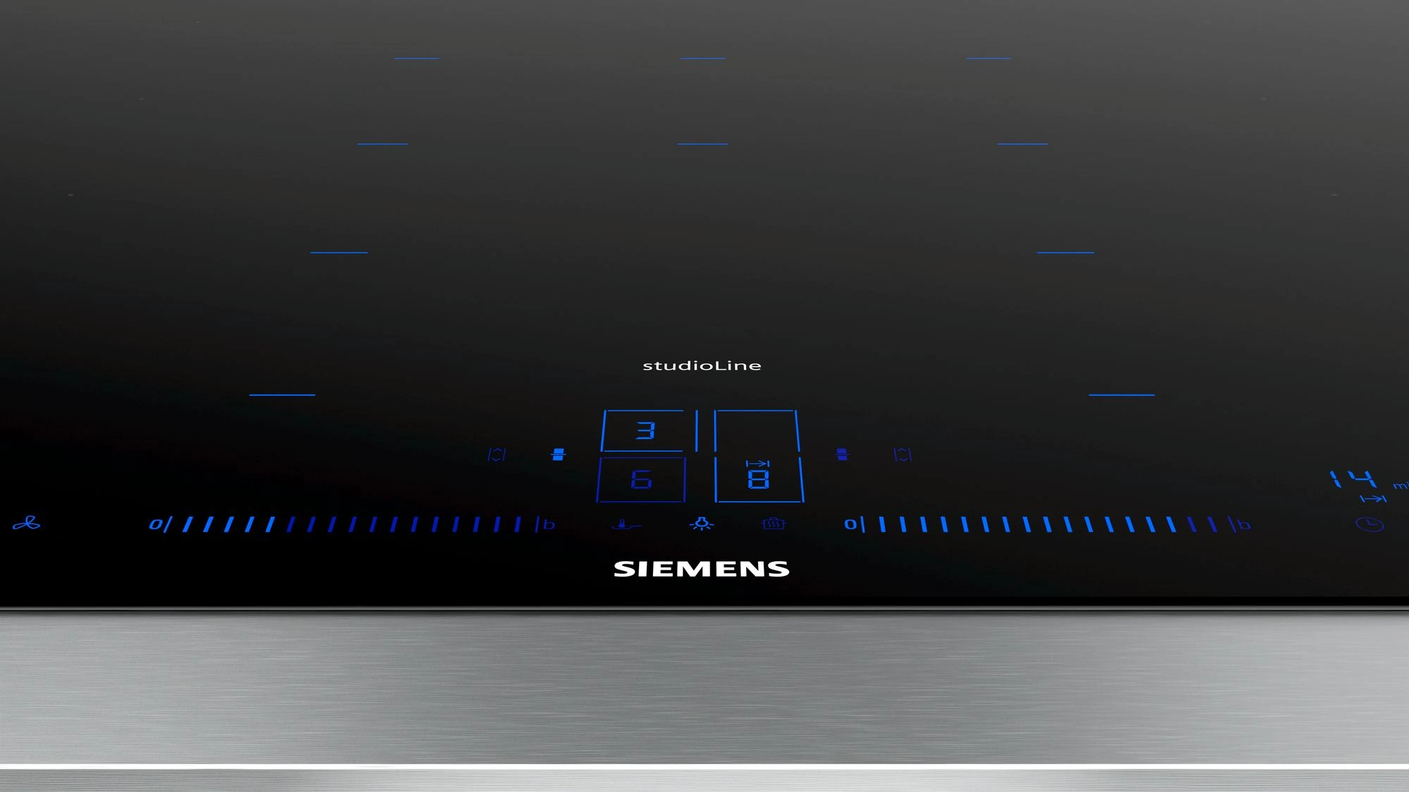 Das Siemens EX808LYV5E Flex-Induktionskochfeld iQ700 aus der studioLine besitzt vier Kochzonen mit praktischer varioInduktion Plus auf 80 cm. Topf- und Pfannengröße werden damit automatisch vom Kochfeld erkannt. Es wird flächenbündig in die Arbeitsplatte eingebaut. Die Bedienung erfolgt über einen dualLight Slider mit blauer Anzeige. Highlights sind vor allem der Brat- und Kochsensor sowie Siemens powerMove Plus, bei der sich das Kochfeld in drei verschiedene Heizzonen aufteilt (Kochen, köcheln, warmhalten).