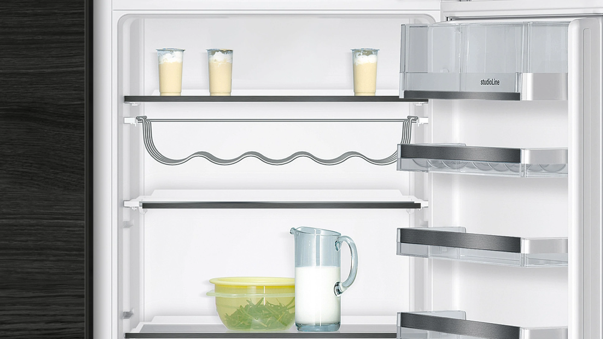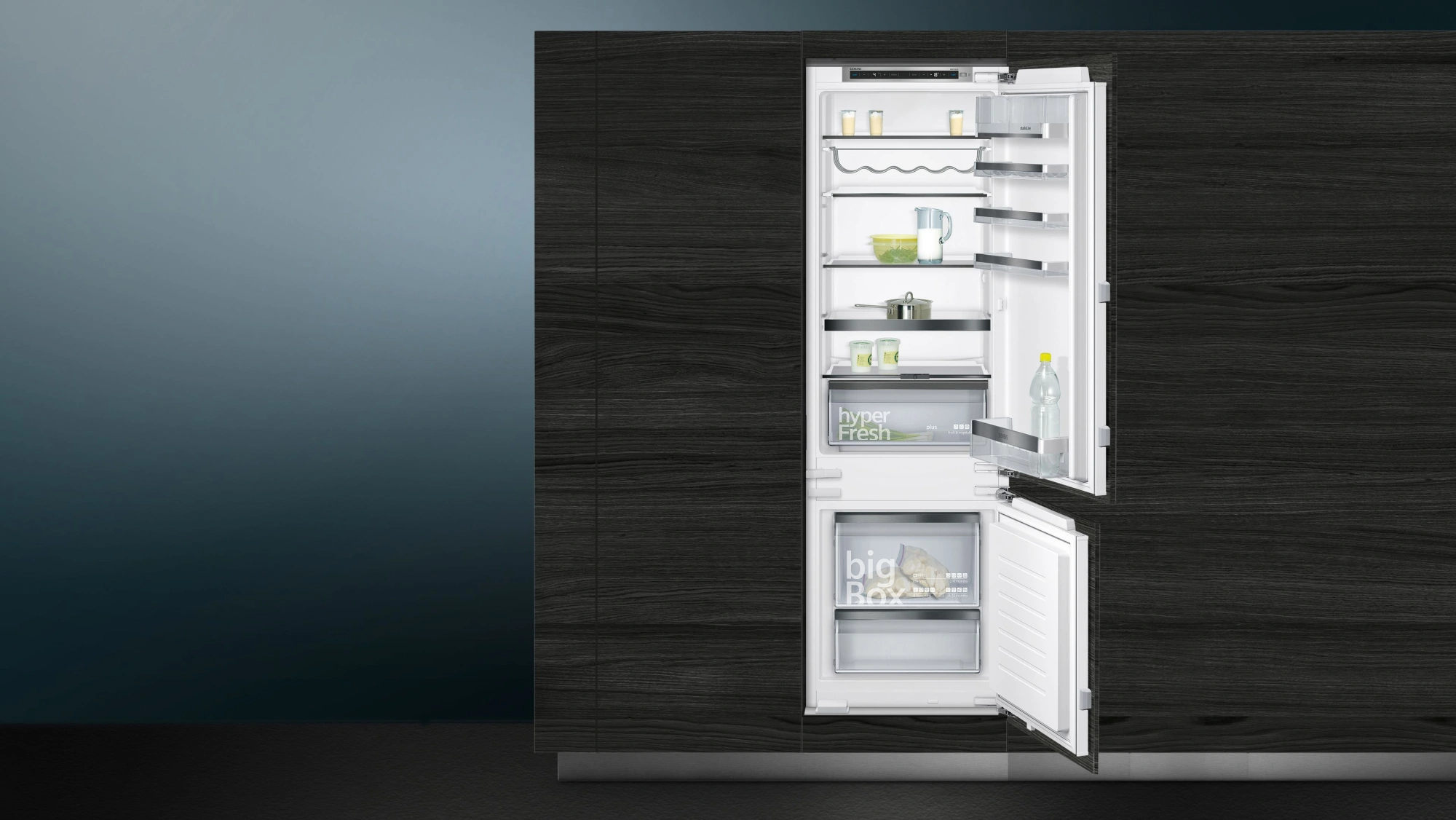 Die Siemens KI87SSDE0 iQ500 Kühl-Gefrierkombination vereint einen Kühlschrank mit Gefrierschrank aus der Premium-Serie studioLine. Auf 272 Liter bietet die Einbau-Kombination viel Raum zum Kühlen und Gefrieren von Lebensmitteln. Zu ihren Features gehören die Abtau-Automatik LowFrost für weniger Eisbildung, hyperFresh Plus für 2x länger frische und knackige Lebensmittel und die Gefrier-bigBox zur Lagerung von großem Gefriergut.
