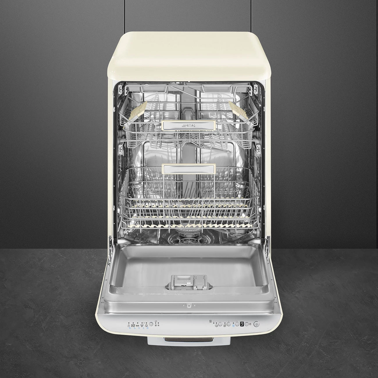 50's Style ist eine Retro Design-Serie von Smeg, die sich durch kurvenreiche Formen und lebhafte Farben auszeichnet. Espressomaschine, Küchenmaschine, Kühlschrank, Dunstabzugshaube, Mixer, Wasserkocher und Toaster erscheinen im Stil der 50er Jahre. Smeg 50's Style Geschirrspüler sind Made in Italy und verkörpern italienisches Design plus technische Spitzenleistung.