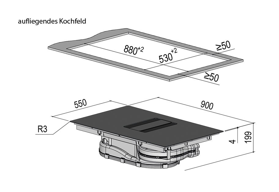 - Zentrale Bedienung von Kochfeld und Absaugung über beleuchtete Touchbedienung mit Slide-Funktion oder elegante Drehknebel